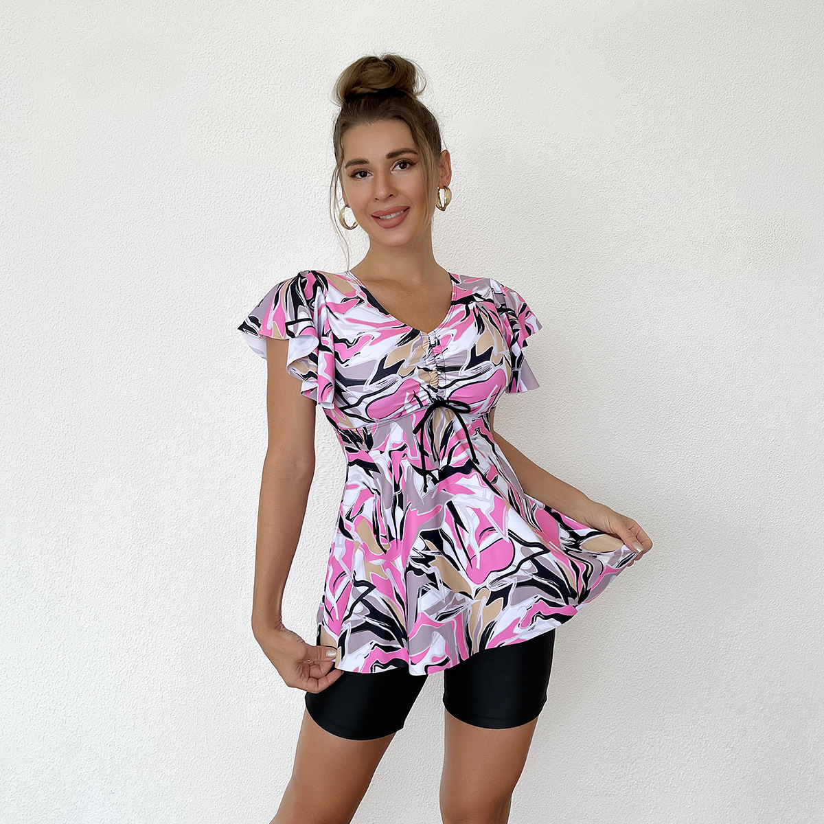 • New skirt style printed swimsuit women's belly covering flat corner conservative Tankini set